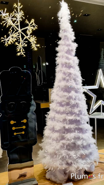 Verleihen Sie Ihrer Weihnachtsdekoration einen Hauch von Originalität und Raffinesse mit diesem wunderschönen Weihnachtsbaum, der mit einer Boa aus weißen Hahnenfedern geschmückt ist. Seine weiche, luftige Textur erinnert an frischen Schnee und schafft eine märchenhafte, elegante und moderne Atmosphäre.